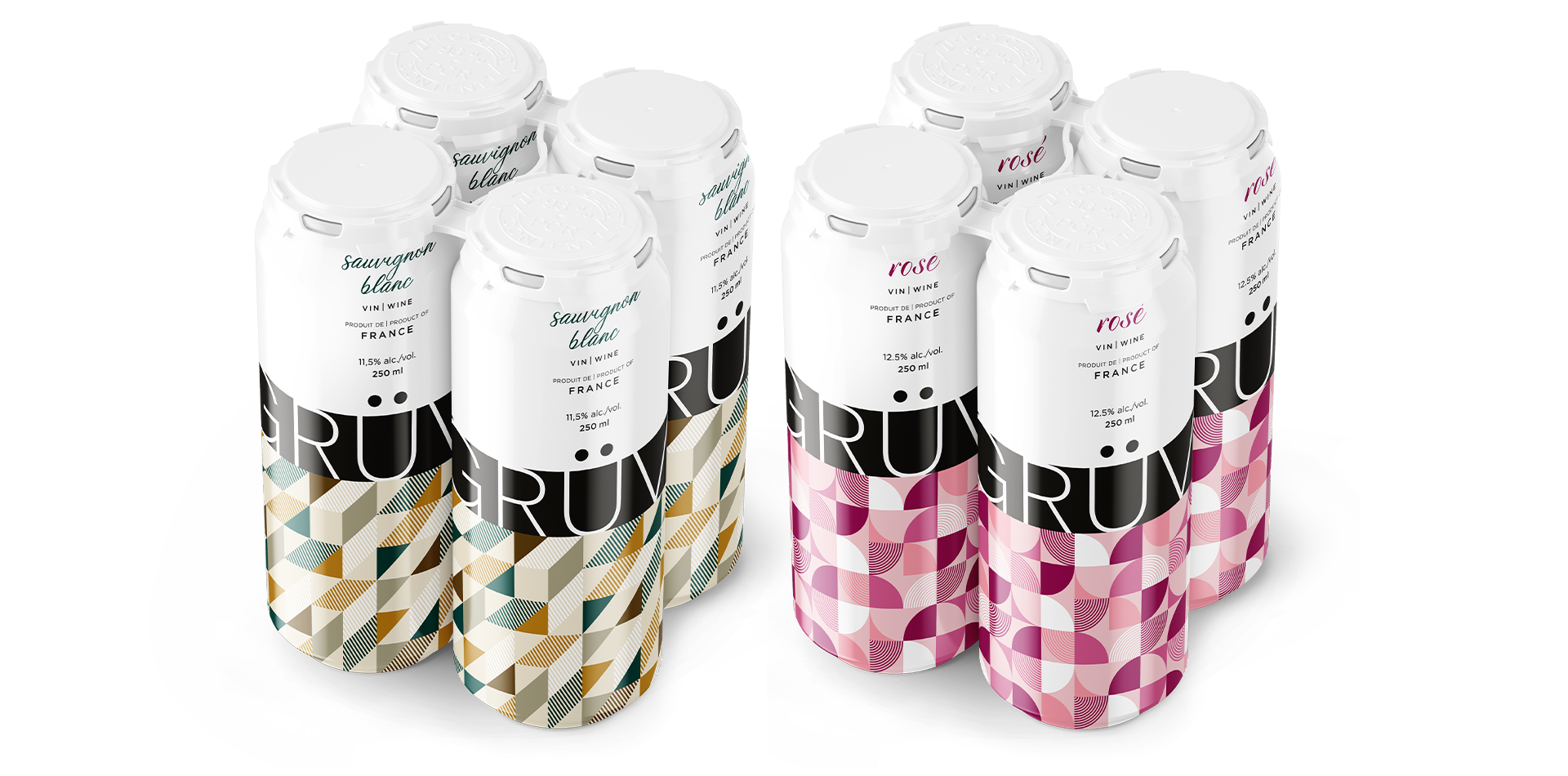 Entering the rapidly growing single-serve premium wine category needs to be done with precision, planning, and outstanding shelf presence. Montreal-based Grüv Vins looked to us for branding and packaging design for their new line of wines in 250mL slim can format. Grüv Rosé and Sauvignon Blanc variants are now available at SAQ locations across Québec.